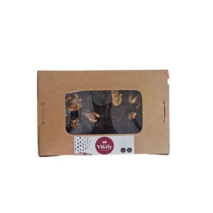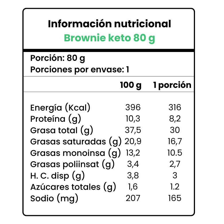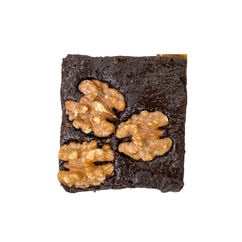 Brownie keto, sin harinas refinadas, sin azúcar, elaborado a base de chocolate 85% cacao, alulosa pura 100%, harina de almendras, mantequilla de campo, huevos y nueces.
