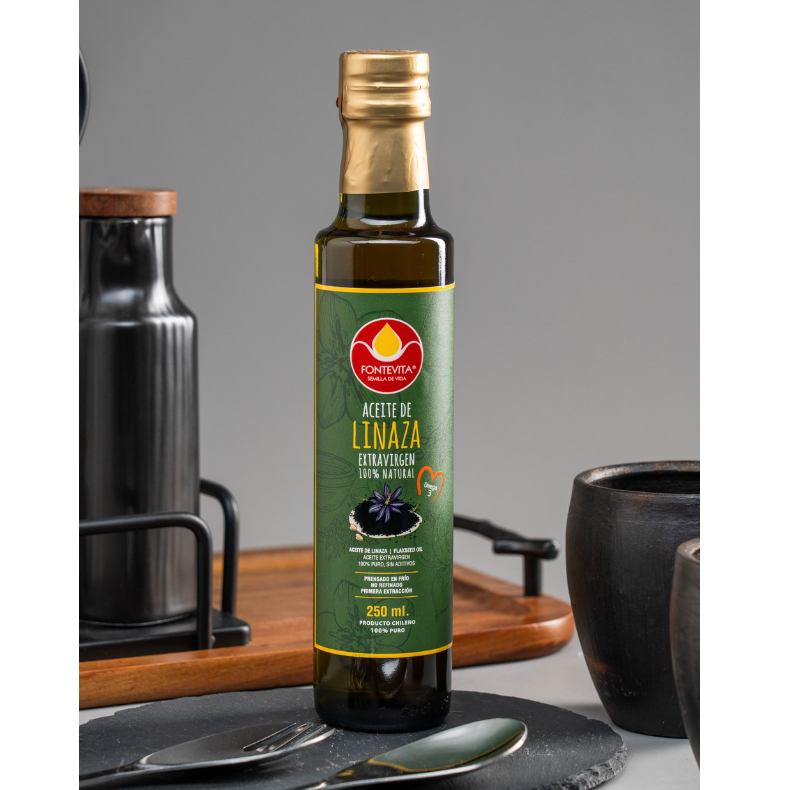 El aceite de linaza aporta los ácidos grasos que son considerados esenciales y que el cuerpo no puede producir por sí solo. Aceite prensado al frío.