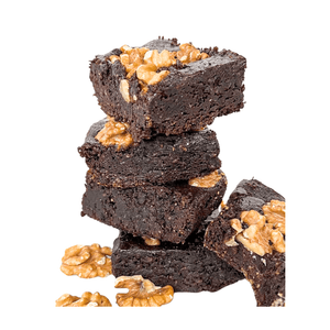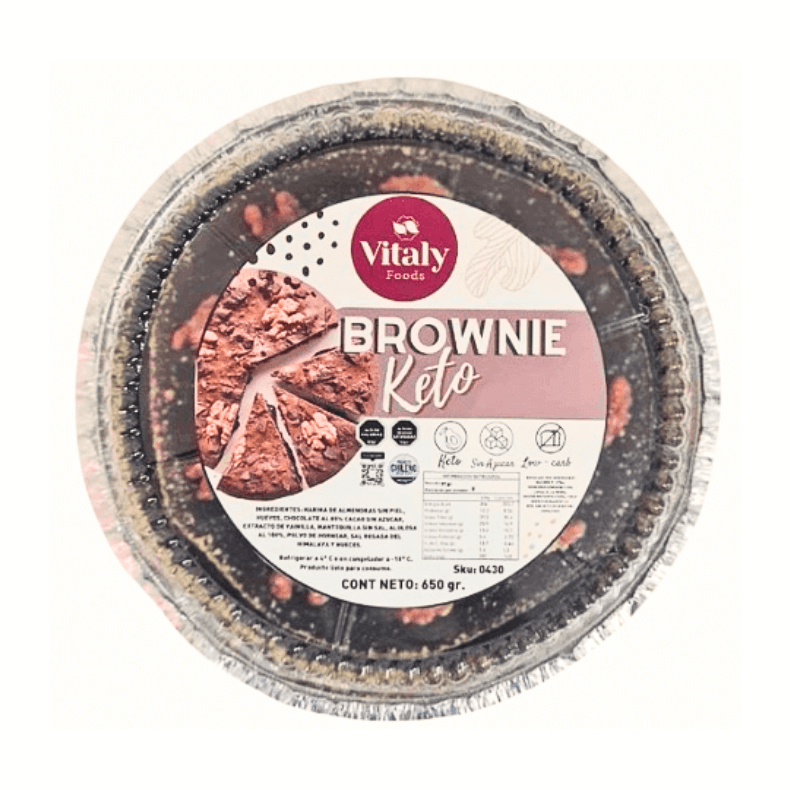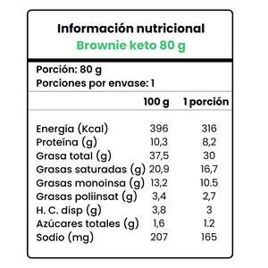 Brownie keto, sin harinas refinadas, sin azúcar, elaborado a base de chocolate 85% cacao, alulosa pura 100%, harina de almendras, mantequilla de campo, huevos y nueces.