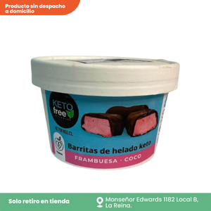 5 barras de helado keto relleno de frambuesa y coco. Solo disponible para pedidos con retiro en tienda y apps de delivery: Rappi y UberEats. Las barras de helado de Ketofree es un producto congelado que no se ofrece para envío debido a que podría descongelarse durante el traslado.