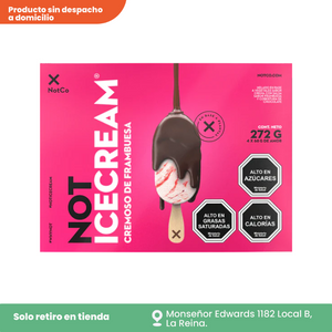 Helado en paleta vegano sabor frambuesa 65 g. Solo disponible para pedidos con retiro en tienda y apps de delivery: Rappi, PedidosYa o UberEats. El helado NOT ICECREAM es un producto congelado que no se ofrece para envío debido a que podría descongelarse durante el traslado.
