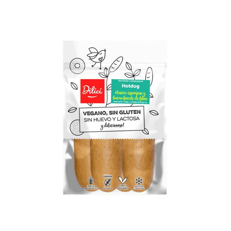 Pan de hot dog artesanal, que utiliza su propia mezcla de harinas. Es un pan suave y tierno, con sabor ligero. Buena fuente de fibra, sin gluten, sin lactosa, sin huevo. Producto vegano.