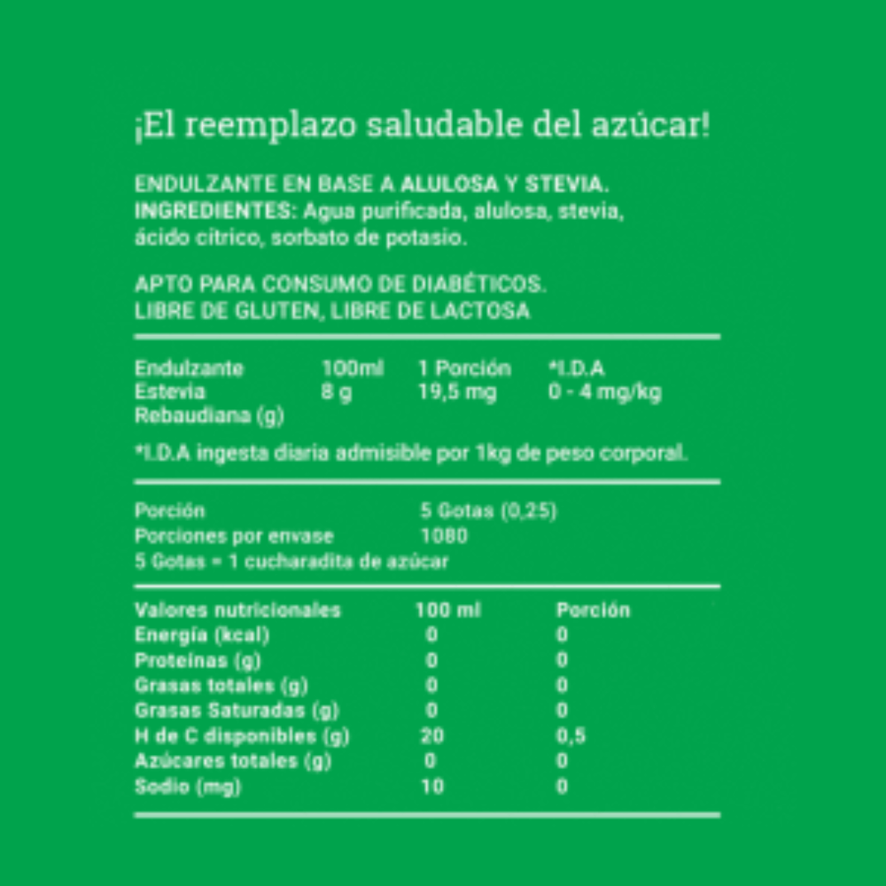 Es un endulzante tres veces más dulce que el azúcar y libre de calorías, muy recomendado para ser utilizado en bebidas e infusiones.