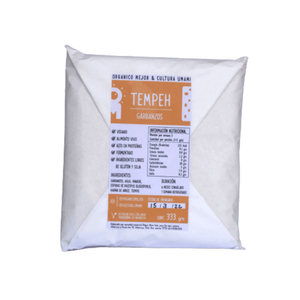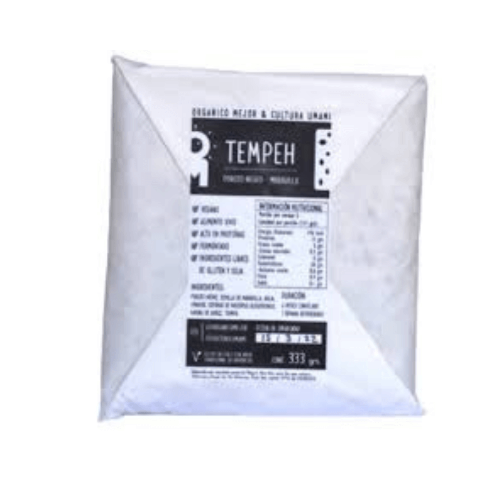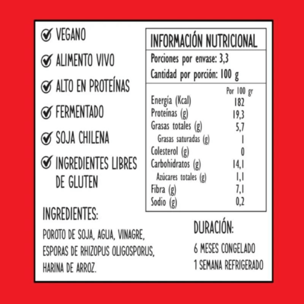 Tempeh tradicional soja: Poroto de soja, agua, vinagre, esporas de rhizopus oligosporus, harina de arroz.