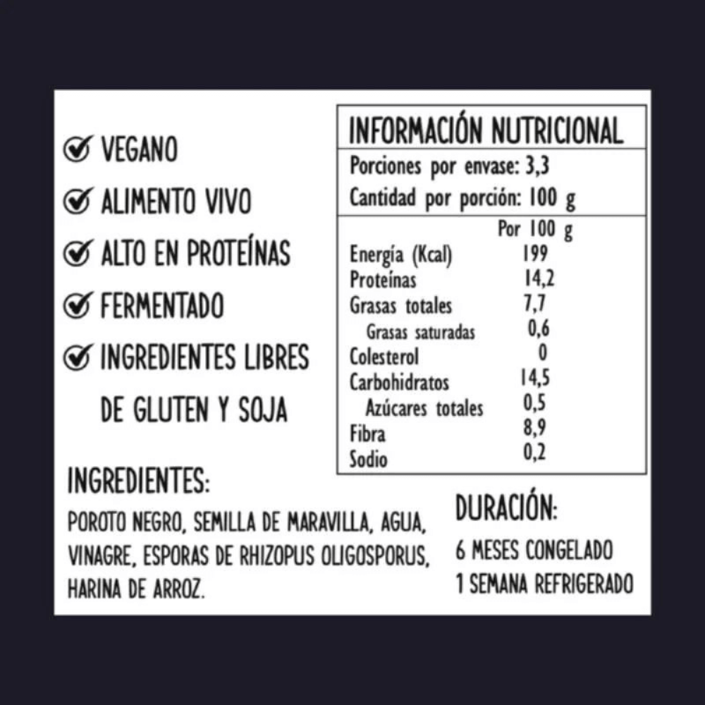 Tempeh poroto negro maravilla: Poroto negro, semilla de maravilla, agua, vinagre, esporas de rhizopus oligosporus, harina de arroz.