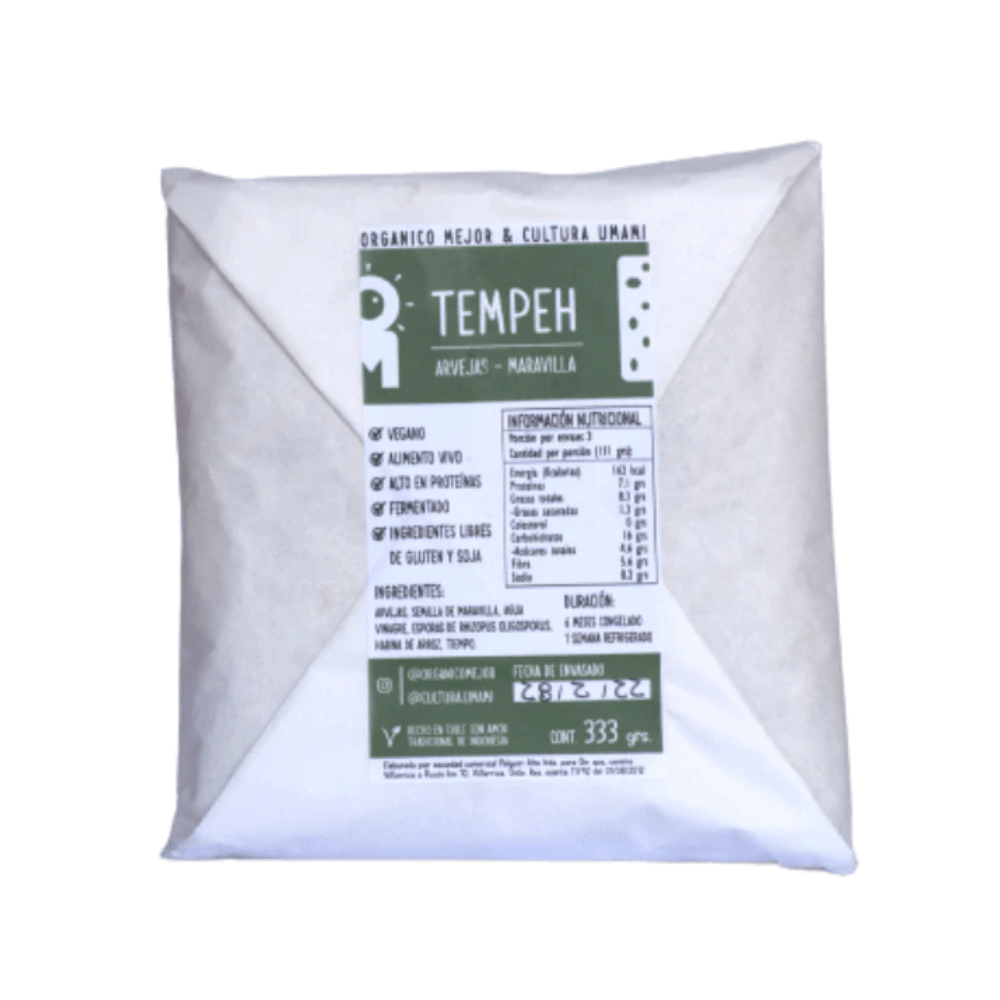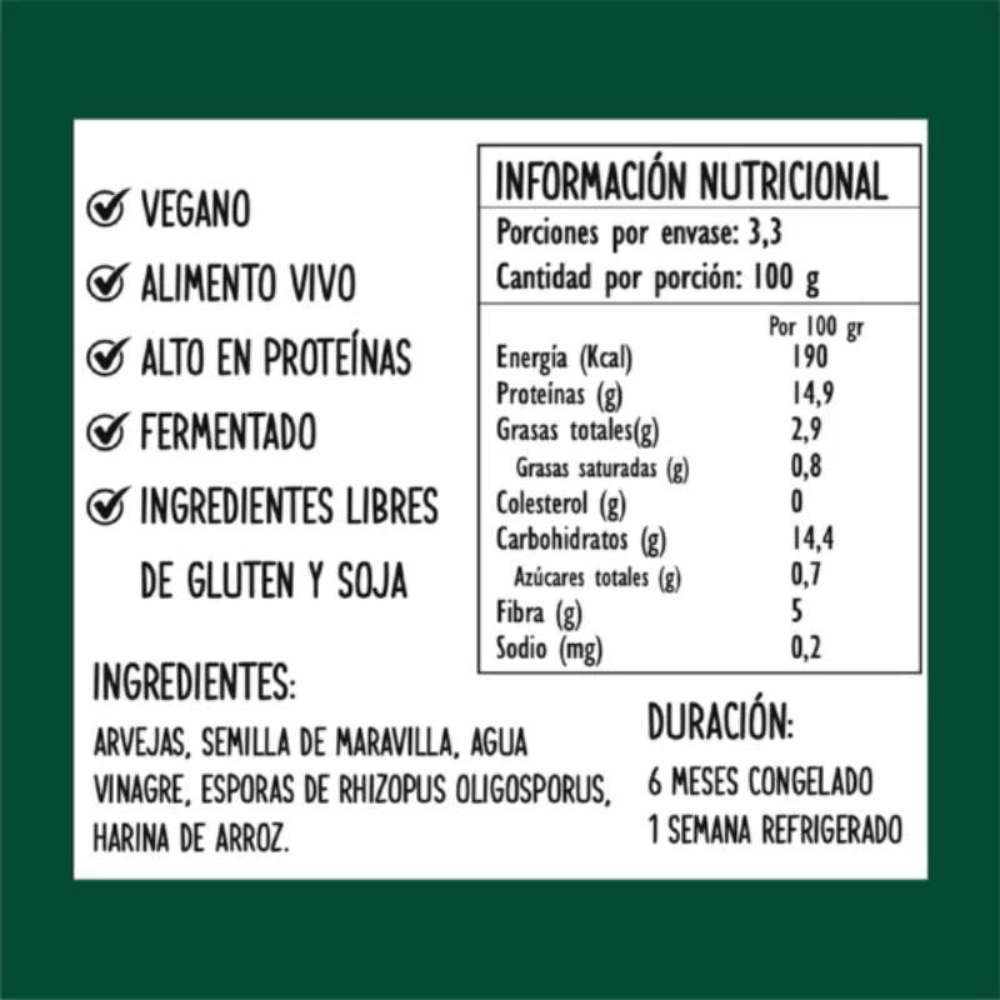 Tempeh arvejas maravilla: Arvejas, semilla de maravilla, agua, vinagre, esporas de rhizopus oligosporus, harina de arroz.