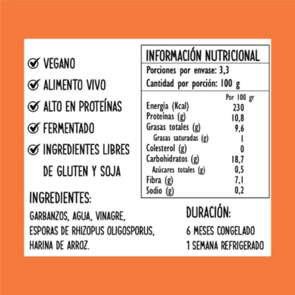 Tempeh garbanzos: Garbanzos, agua, vinagre, esporas de rhizopus oligosporus, harina de arroz.