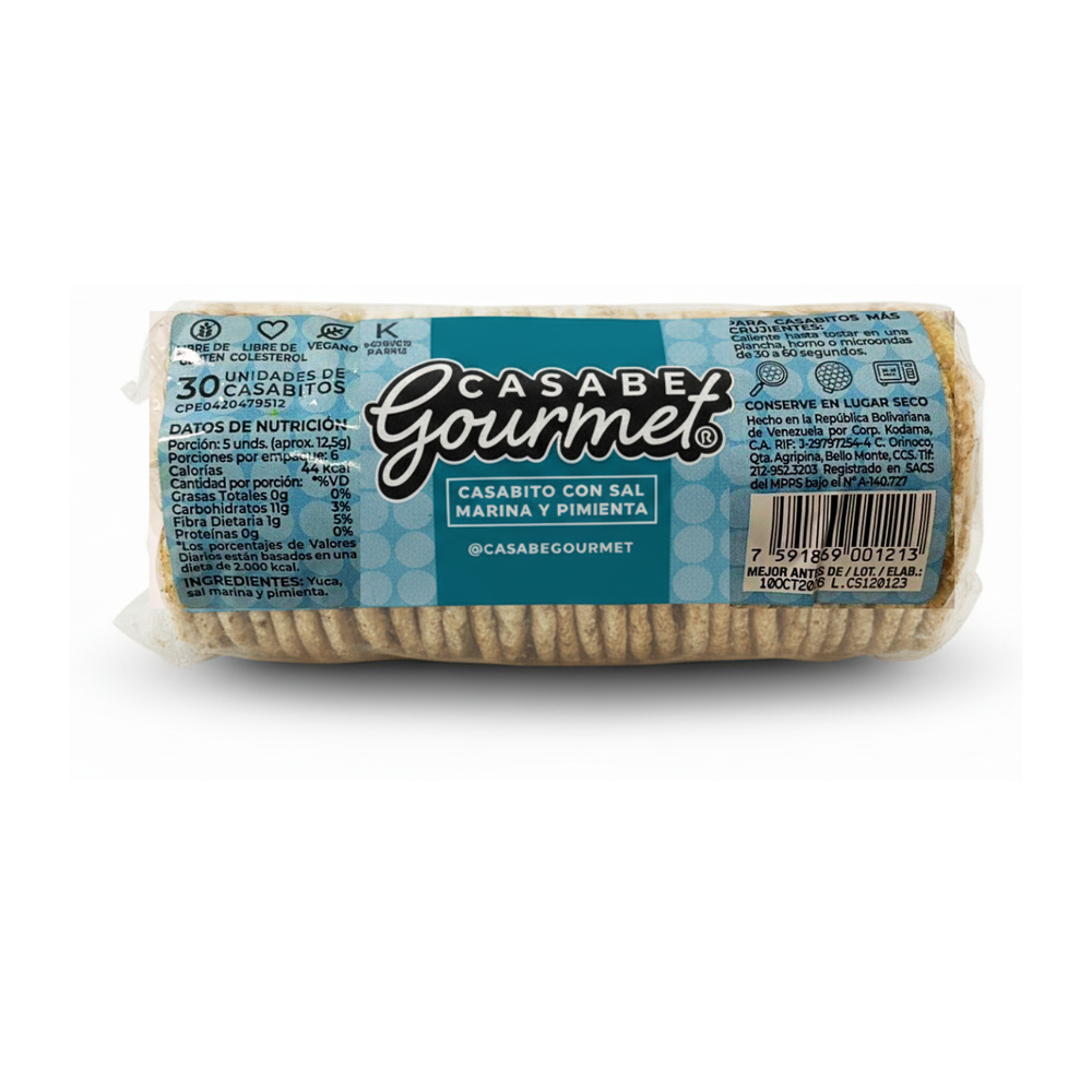 Este producto es una galleta crujiente y plana, hecha de yuca, sazonada con sal marina y pimienta, ofreciendo una opción sin gluten, vegana y alta en fibra, popular como snack saludable o acompañamiento.