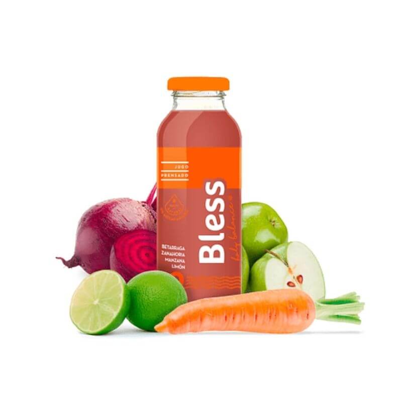 Producto natural elaborado mediante una técnica de prensado a base de betarraga, manzana, zanahoria y limón, sin agua añadida, sin presencia de emulsionantes, azúcares artificiales, colorantes y ni conservantes.