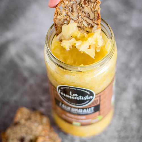 Chucrut de repollo fermentado de repollo verde, cochayuyo, limón, cebolla y sal de mar.